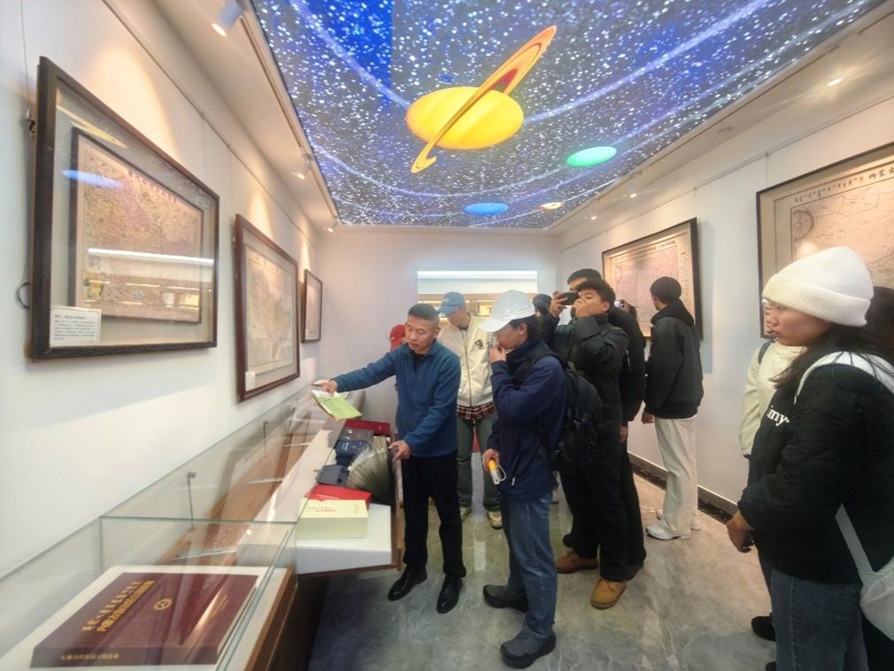 地图编制研发部连锁副部长热情接待师生,首站走进地图成果展厅。从泛黄的古典舆图、手绘地图,到现代电子地图、3D地形模型,从国家出版基金项目《内蒙古历史沿革地图集》,到服务“一带一路”“呼包鄂乌一体化”的专题图件,展品串联起内蒙古的地理与历史脉络。地图不是死图纸,是讲空间故事的语言——《历史沿革图》用疆域变迁说清历史,专题图把向北开放变成可量化的交通、产业节点。连锁副部长以“技术迭代”为线,讲解从传统手工描摹到数字孪生建模的变迁,让学生直观感受到“所学测绘地理信息、遥感技术能落地服务国家战略”。